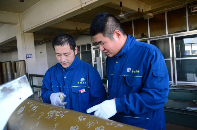 圖為花布車間制網工序的張海亮(左)與張彬彬在安裝悶頭前,再次查看驗證鎳網質量。