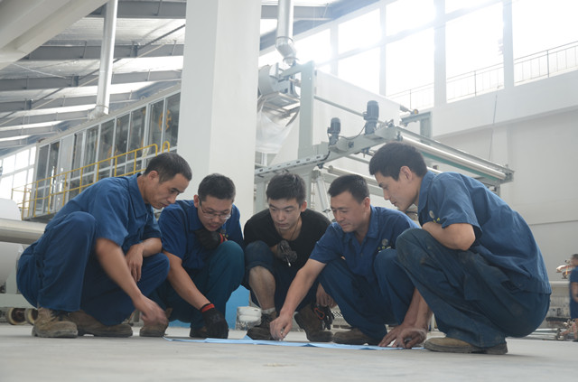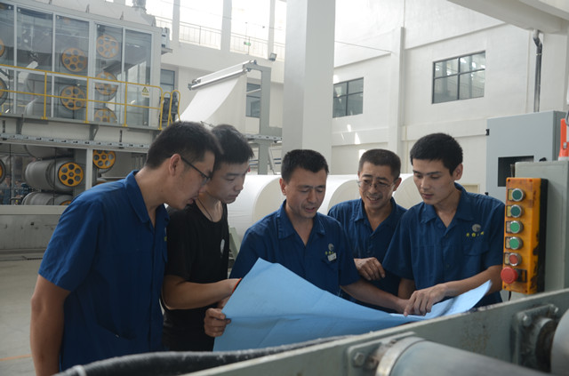 圖為家紡車間機電維修人員正在生產(chǎn)現(xiàn)場,對照設(shè)備圖紙進行現(xiàn)場培訓和討論。