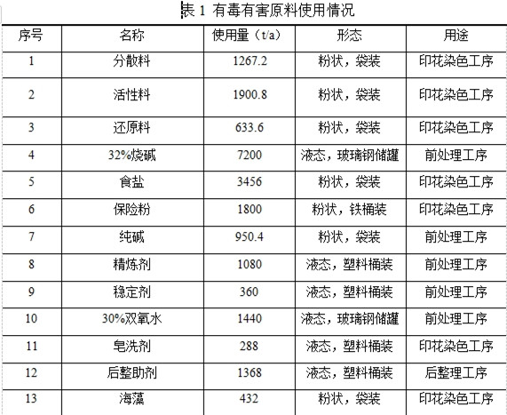 華紡股份有限公司現(xiàn)有項目使用的原料包括分散料、活性料、還原料、燒堿、保險粉、純堿、精煉劑、穩(wěn)定劑等,其使用情況見表1。