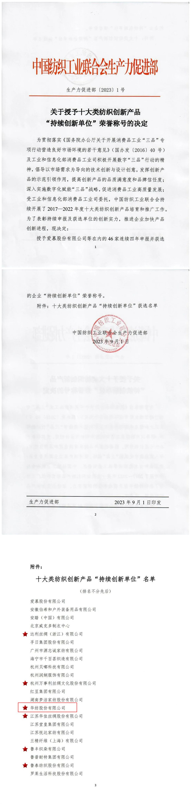 為表彰持續(xù)申報及獲選單位的創(chuàng)新實力,推進企業(yè)加快產品創(chuàng)新進程。近日,中國紡織工業(yè)聯(lián)合會生產力促進部發(fā)布“關于十大類紡織創(chuàng)新產品‘持續(xù)創(chuàng)新單位’榮譽稱號的決定”,授予華紡股份有限公司等在內的46家連續(xù)四年申報并獲選的企業(yè)“持續(xù)創(chuàng)新單位”榮譽稱號。
