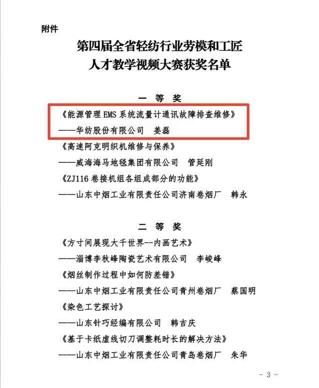 近日,山東省輕工紡織工會(huì)委員會(huì)組織開(kāi)展的第四屆全省輕紡行業(yè)勞模和工匠人才教學(xué)視頻大賽評(píng)比結(jié)果揭曉,經(jīng)專家評(píng)審和網(wǎng)上公眾投票,評(píng)出一等獎(jiǎng)3名、二等獎(jiǎng)4名、三等獎(jiǎng)5名、優(yōu)秀獎(jiǎng)7名。公司電氣車(chē)間儀表技術(shù)員姜磊報(bào)送的《能源管理EMS系統(tǒng)流量計(jì)通訊故障排查維修》項(xiàng)目榮獲大賽一等獎(jiǎng)。