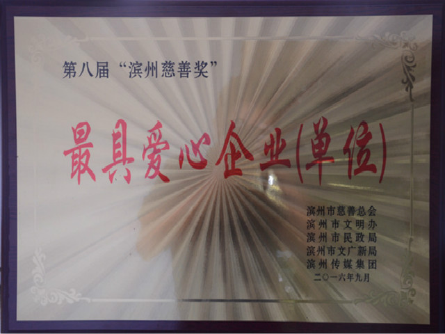 近日,由濱州市慈善總會、市精神文明建設委員會辦公室、市民政局、市文化廣電新聞出版局、濱州傳媒集團等聯合舉辦的第八屆“濱州慈善獎”評選表彰活動圓滿結束,公司以對慈善事業(yè)的突出貢獻,榮獲“最具愛心企業(yè)(單位)”稱號。