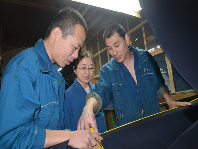 圖為面一車間甲班班長孟繁強(左)、組長孫新強(右)、出檢劉丙娟,在查看當班下機產(chǎn)品的質量情況。